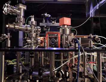 また、光と物質の量子力学的な相互作用を通して、光を使って物質の量子状態を制御することが可能です。例えば、室温では秒速数百メートルで飛び回っている気体原子の運動を、レーザーを使って一気にマイクロケルビン(速度にして秒速数センチメートル)以下にまで冷却し、さらに捕獲することができます。このようにして極低温にまで冷却された原子は、それ自身の振る舞いに量子性が強く発現するばかりか、原子が光子を放出する過程を制御することで、自然には存在しない量子状態の光の発生に利用することができます。従来の計算機では時間がかかって計算できない問題を一瞬で計算してしまう量子コンピュータや、原理的に絶対安全(盗聴が不可能)な量子暗号などが期待される量子情報。本研究室では、光の量子性を積極的に利用し、量子情報への応用を図ります。