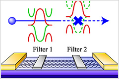 An illustration of current suppression by parity effect as proposed herein. The parity effect prevents tunneling between electronic bands of different parity and allows perfect conductance between bands of common parity, an effect that may prove useful in controlling band gaps. The figure is adopted from a web page at Nature Asia-Pacific that introduces our paper published in Phys. Rev. Lett.