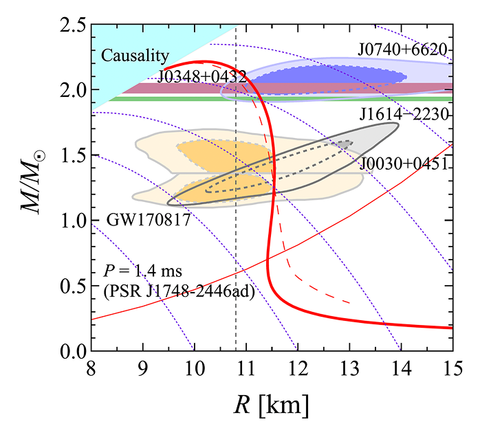 そこで我々は、無限個の核子から成る無限に大きい仮想的な原子核(以下では核物質と呼びます)を考えます。そして、主に変分法を用いて、核物質の多体問題的研究を行う事により、核物質の観点から原子核の大局的性質を理解する事を目指します。 核物質エネルギーの理論計算により、いわゆる核物質の状態方程式(EOS)が得られます。計算された核物質EOSの信頼性を調べるために、我々は宇宙に目を向けます。