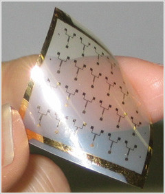 Organic materials have flexibility and printability. Such unique properties might create conceptually novel electronics. We are trying to fabricate flexible and/or printed devices using π-electron materials. For example, we are fabricating single-walled carbon-nanotube transistors by inkjet-printing techniques on flexible plastic substrates (see figure). You can find one of our reports in Advanced Materials 22, 3981 3986, (2010).