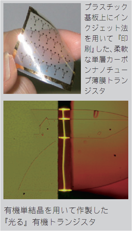 当研究室では、基礎的な物性研究により『パイ電子材料』の本質を理解し、応用研究を通してユニークな特徴を活かした全く新しいエレクトロニクスやオプトエレクトロニクスの提案を目指しています。例えば、単層カーボンナノチューブをインクジェット法でプラスチック基板上に『印刷』し、柔軟なトランジスタの作製に成功しています(図1)。また、有機材料の優れた光機能と電子機能を組み合わせた、光るトランジスタの作製にも成功しています(図2)。どちらも、世界に先駆けた新しい試みです。新しい分野を切り拓くことは、常に未知の困難との闘いです。しかしながら、困難を乗り越えた大きな成功には、それ以上に大きな感動も溢れています。世界を相手にして戦う、気概とやる気に溢れた皆さんの参戦を心待ちしております。