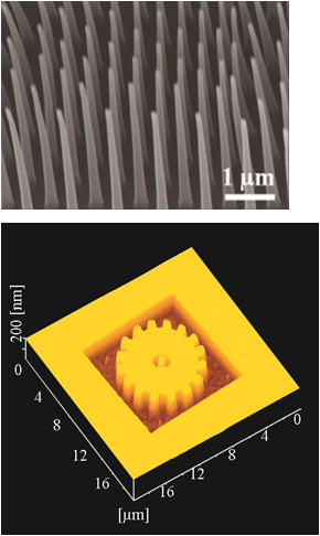 当研究室では、このような事を背景に、超小型の高品質電子ビーム発生装置( 写真上) をはじめとして、プロセス用の電子線装置や、他研究機関設置のイオンビーム装置などを用いて、装置開発や素粒子物理学実験、ビームを応用した新素材、新プロセスの開発を目指した研究を続けています。最先端加速器を用いた物理の分野では、非常に質のよい(エネルギーや進行方向がそろっている)また、非常に短い時間(約1000 億分の1秒)構造を持つ電子ビームを発生させ、それを用いて最先端の計測システム開発や、そのビームをレーザーと相互作用させて新しいビームを作るなどの先端加速器実験を行っています。また産業用加速器を用いたプロセス開発については、高分子材料の機能化(燃料電池膜やマイクロ・ナノ構造体作製)を目指した先端研究を実施しています。写真下に電子線ナノインプリントという転写技術を使って得られた高分子ナノピラーの電子顕微鏡写真と生分解性高分子(ポリ乳酸)をイオンビームで加工して得られたナノギアの原子間力微鏡写真を示します。このような世界最先端の研究に興味のある方は一度研究室をお尋ねください。きっと面白いテーマが見つかりますよ。